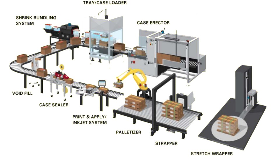 A fully automated packaging line integrates several subsystems, each communicating through a central control architecture.